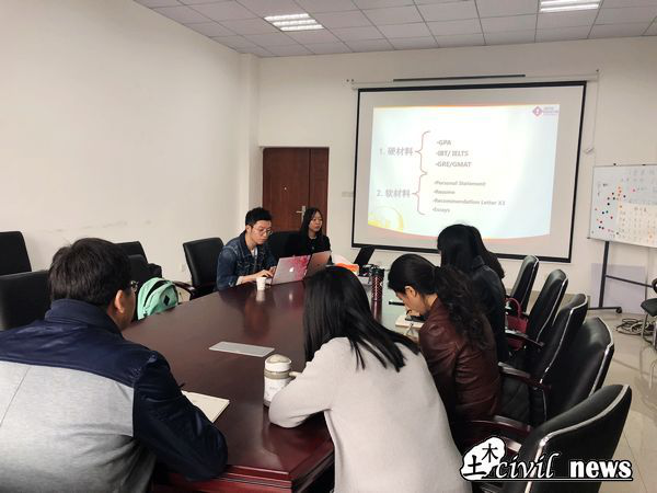 10月26日上午10:00,土木学工组在犀浦4312会议室开展了员工出国留学专题交流活动,学工组邀请到成都智拓教育咨询公司的张陵老师和梁睿老师进行分享,出席活动的老师有人才招聘处就业指导科科长彭黎明,jn江南分团委书记刘萍,分团委副书记付真珍,分团委副书记黄雪娇,就业工作负责老师任福以及相关辅导员等。