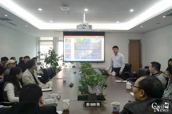 上午9时30分,高文君研究员首先展开了主题为“防灾·减灾战略与抗震设计技术”的学术报告。高文军研究员有着多年的海外留学和工作经验,在结构抗震方面有着深入的研究。在报告期间,他无私的分享了一些自己在该领域的独到见解,听众受益颇多,同时也体会到了防灾、减灾以及抗震设计巨大的发展潜力和广阔的应用前景。
