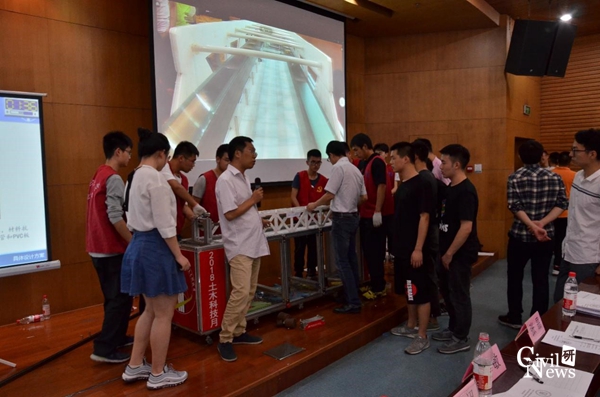 在主持人单雨的宣布下,比赛正式开始,选手们一个个忐忑的抬着自己的模型进入加载台,每组由一位同学进行时长4分钟的PPT答辩,每组都为老师准备了各自的计算书,供老师查阅作为评分依据。加载分为预加载,第一次加载和第二次加载,一次比一次难度更大,更让人紧张不已。由于赛题较难,在前面几组加载中未有一组通过了预加载,模型均不同程度损坏,评审老师就桥梁结构形式,损坏原因向大家进行讲解。但大家任然心中充满忐忑,场面一度十分焦灼,但是接下来随着一些制作精美,力学计算严谨的参赛作品被搬上加载台,一个个记录被渐渐打破,台下传来惊叹而又崇敬的掌声和欢呼声。现场气氛热烈,每一组上台,大家都捏一把汗,大家不再是只关注自己的作品,也为他人加油鼓气,不足之处互相交流经验,在这愉快的交流学习中,增进了友谊,学到了经验。在愉快的氛围中,比赛圆满结束。