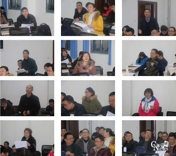 随后参会老师们一起互动讨论,发言踊跃,广开言路、气氛活跃,肯定了这次聘任改革对团队建设与学院发展的重要性,纷纷表示支持本次岗聘改革,愿意为学院发展出力,一致期望学院能够发展得更好。申玉生、于丽、张方、张志强、郑余朝、周佳媚、蒋雅君、潘毅、罗忠贤、许炜萍、孙晓丹、王耀琴、方勇等多位老师围绕国家级项目、高水平论文、发明专利成果转化、个人及团队岗位要求、高水平国际会议、教学学时、教改项目、教材建设及规范标准编制等方面提出了宝贵的建议,对学院教师聘任方案进一步完善具有重要价值。