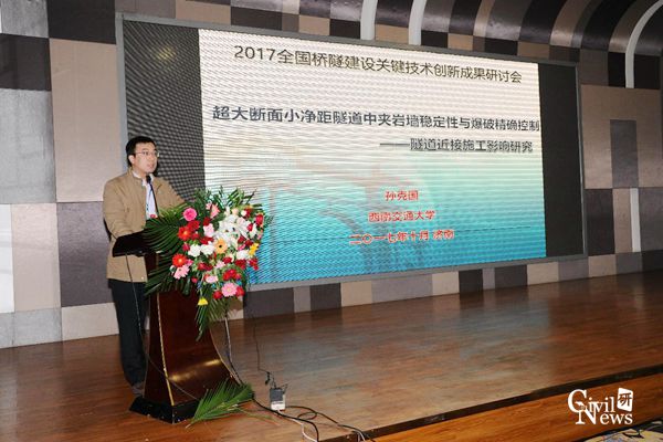 2017年10月13~14日,由中国公路学会和山东高速集团联合主办的“2017全国桥梁与隧道建设关键技术创新成果研讨会”在山东省济南市隆重召开。交通运输部周伟总工程师、中国工程院王景全院士、王复明院士及来自全国各地的340余名专家、代表参加了会议,会议就我国桥梁、隧道建设新成果进行了集中展示。公司孙克国老师以大会报告“超大断面小净距隧道中夹岩墙稳定性与爆破精确控制”的形式分享了项目的部分研究成果,重点介绍了超大断面小净距隧道的近接施工影响,为济南市连接线工程六条隧道的小净距段提供了技术指导。