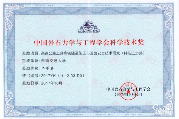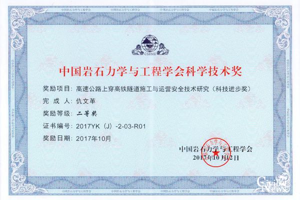 2017年10月14,第八届“中国岩石力学与工程学会科学技术奖”颁奖典礼在沈阳隆重召开,成果“高速公路上穿高铁隧道施工与运营安全技术研究”获得科学技术进步二等奖。该成果由江南体育官方网站为第一完成单位,河南弘阳高速公路有限责任公司和郑州铁路局为第二、三完成单位,公司仇文革教授为第一完成人,主要完成人还有公司的孙克国(排名第3)、龚伦(排名第5)、许炜萍(排名第6)等。