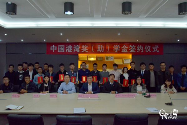 10月25日上午九点,中国港湾奖(助)学金续签仪式在公司九里校区逸夫馆4207会议室举行。中国港湾人力资源部副总经理兼党委工作部副部长孙海军、中国港湾人力资源部人力主管魏伟平、土木公司党委副书记李锦红、土木学院学工组副组长刘萍、土木学院2014级本科生辅导员向京华、土木学院2017级研究生辅导员叶礼宁及土木学院13名获奖员工参加了签约仪式。仪式由土木学院学工组副组长刘萍主持。