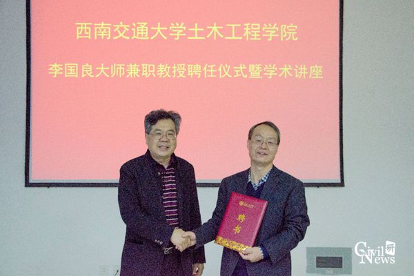 首先,王明年教授对李国良大师的到来表示热烈欢迎,并简要介绍了大师的基本情况以及在挤压性围岩变形控制技术方面取得的成就。随后聘任仪式开始,董事长助理何川教授代表学校热烈欢迎李国良大师成为公司兼职教授,并向李大师颁发聘书和佩戴校徽。