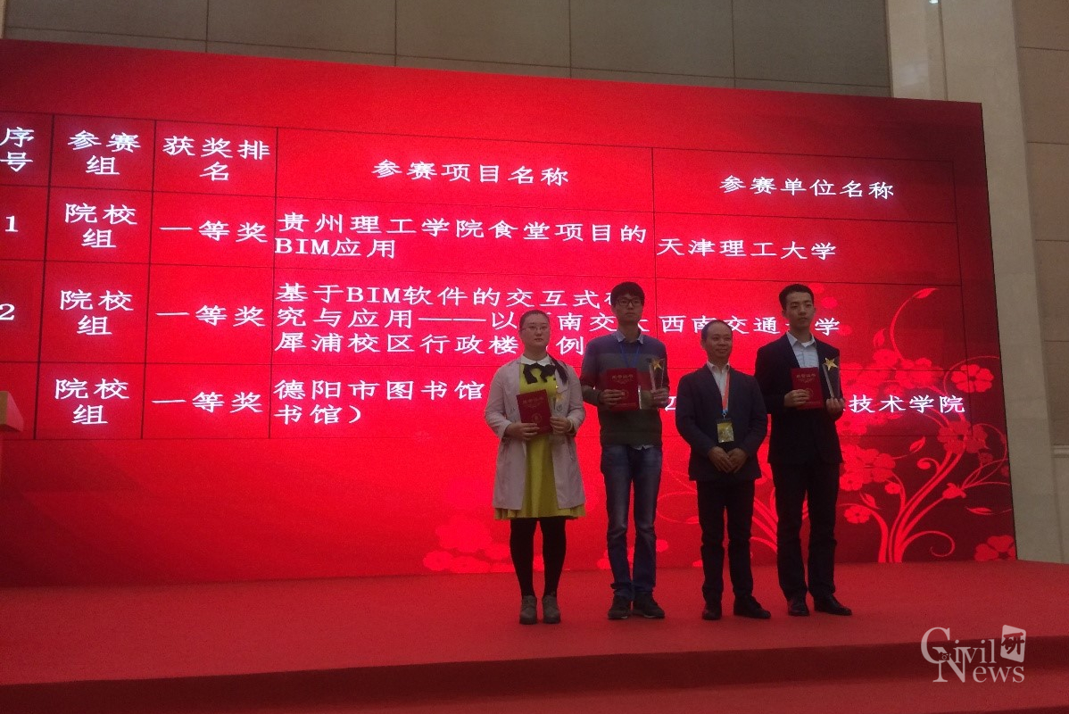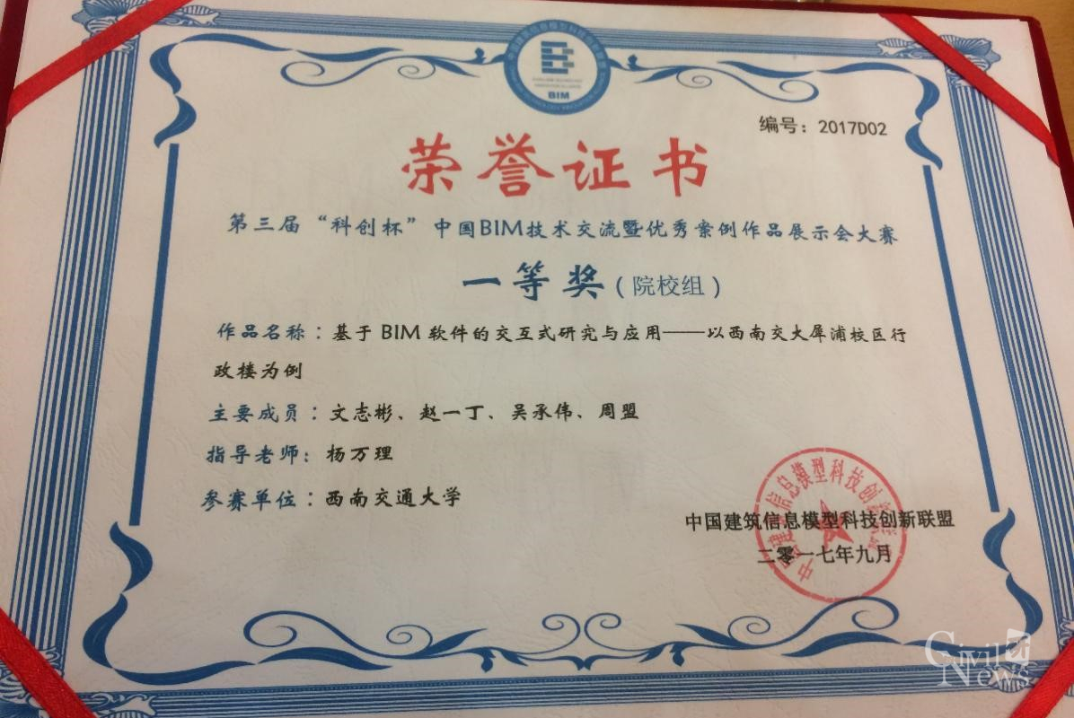 2017年10月13日上午,第三届“科创杯-中国BIM技术交流暨优秀案例作品展示会大赛”在北京顺义区国展中心新馆W201会议厅顺利举行。2015年、2016年,在住建部及住博会组委会的支持下,中国建造师联盟联合国内优秀BIM单位益埃毕集团、北京弘洁建英科技有限责任公司等企业,组织了年度中国BIM技术交流会暨优秀案例作品大赛。经过两年发展,现今“中国BIM技术交流会暨优秀BIM案例作品展示会大赛”已成为国内知名的BIM大赛之一。本次大赛院校组共有46份作品参赛,历经组委会专家评委层层筛选,最终公司参赛作品《基于BIM软件的交互式研究与应用—以西南交大犀浦校区行政楼为例》脱颖而出,荣获大赛一等奖。
