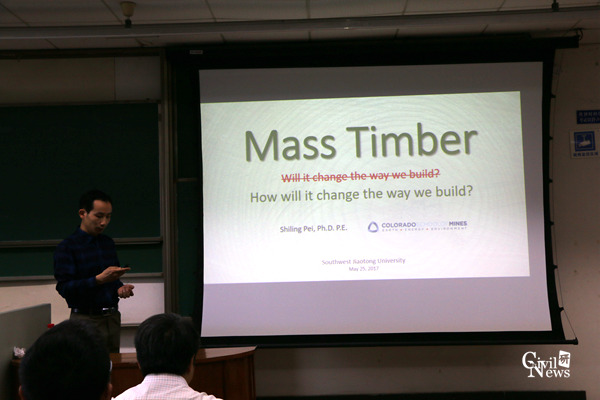 5月25日上午,美国科罗拉多矿业大学土木与环境工程系博士Shiling Pei(裴适龄)应邀于公司逸夫馆4407B教室举办了一场关于重木结构在现代建筑中的研究与运用的学术报告。jn江南相关教师与部分员工聆听了讲座。