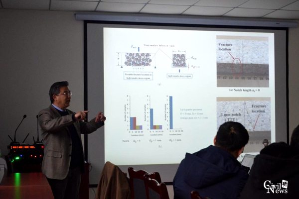 胡晓智教授的报告内容主要分为三个方面。首先,胡教授简要介绍了混凝土、岩石等准脆性材料、金属材料等断裂破坏的尺寸效应机理及结构完整性分析。基于此,胡教授介绍了他及所领导的团队建立的“Hu-Duan Boundary Effect Modeling”即“边界效应模型(BEM)”的发展历程。通过大量的三点弯曲试验,他的团队发现岩石和混凝土裂纹扩展是与材料骨料粒径紧密相关的,因此提出了一种考虑骨料(或最大颗粒)粒径计算混凝土和岩石断裂强度的计算方法,与其他计算方法相比,胡教授提出的方法第一次引入材料骨料粒径影响、第一次提出stepwise cracking、第一种不含任何经验参数的计算方法并且是第一种非线弹性断裂预测型模型。该模型在结构完整性分析中更加精确,具有广阔的应用前景。第二,胡教授以江南体育官方网站联合培养博士钟志斌所取得实验成果为例子,介绍了断裂力学在岩石破坏中的应用。最后,胡教授鼓励年轻人首先要享受自己的科研,制定一个长远的目标,将自己的热情和时间投入到学习和工作中,更重要的是要对自己保持信心,大胆勇敢地探索。