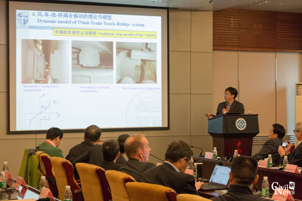 在研讨会期间,公司教师积极参与会议报告。郑史雄教授作了题为《The dynamic performance of long span high-speed railway bridge under wind》的报告,李小珍教授作了题为《Vehicle-bridge coupling dynamic theory and engineering application》的报告,占玉林副教授作了题为《Research on the long-term displacement of concrete arch bridge for high-speed railway in China》的报告,与会专家学者对公司教师的报告展开了热烈而深入的讨论。