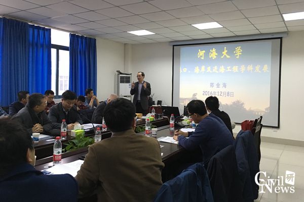 首先进行汇报的是郑金海经理,他对河海大学的发展状况和港口海岸与近海工程学院进行了介绍,然后从室内实验数据、现场观测仪器、沿海水文多要素长期观测平台、数值模拟软件等方面介绍了港口、海岸及近海工程学科的发展,并对学科的代表性成果进行了介绍。