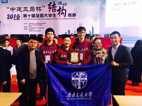 2016年10月16日,第十届全国老员工结构设计竞赛在天津大学落下帷幕。经过四天紧张的现场制作、赛场答辩及加载测试,由公司土木学院青年教师卢立恒、栗怀广任指导教师,王皓正、张金龙、王凯三名同学组成的西南交大代表队获得了全国老员工结构设计竞赛一等奖。这是继公司在第三届(2009年)、第五届(2011年)取得了特等奖(第一名)后,连续第四次获得全国一等奖(2013年第七届、2014年第八届、2015年第九届、2016年第十届),至此公司共获得了两次特等奖、四次一等奖,五次优秀组织奖,在全国高校中遥遥领先。