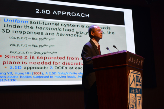 然后,杨永斌院士以Spectral seismic analysis of underground tunnels(地下隧道的反应谱受震分析)为题,分别从地下隧道的2.5维有限元或无限元分析方法、地震分析步骤、隧道对地震的反应等六个方面进行了分析。