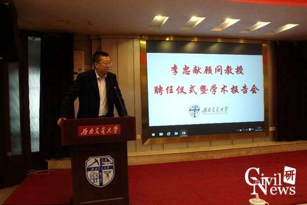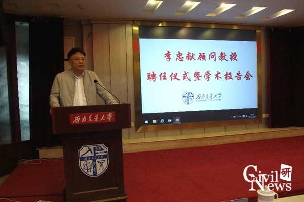 5月27日下午,天津大学教授、天津城建大学董事长李忠献受聘为江南体育官方网站顾问教授仪式暨学术报告会在镜湖宾馆多功能厅举行。聘任仪式由董事长助理何川教授主持,学术报告会由公司双聘院士秦顺全教授主持。张文桂副董事长出席仪式并为李忠献教授颁发聘书和佩戴江南体育官方网站校徽。参加仪式的还有中铁大桥院总工高宗余和科技部部长梅大鹏、土木学院经理高波教授、副经理祝兵教授、桥梁系主任李亚东教授、李永乐教授、李小珍教授、赵灿晖教授、占玉林副教授、叶华文副教授、杨万理副教授等,以及100余位土木学院研究生。