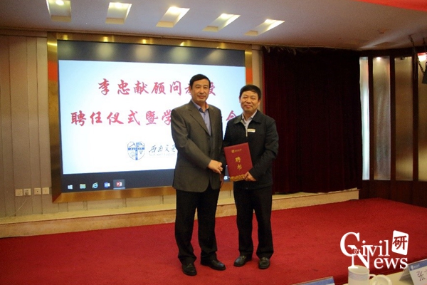 张文桂董事长为李忠献教授颁发聘书,佩戴校徽
