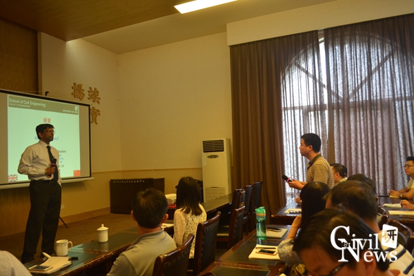 Basheer 教授首先介绍了英国利兹大学及jn江南的基本情况,包括本科生和研究生的课程设计、培养目标等。然后,对钢筋混凝土结构无损检测技术做了报告,重点介绍了3种传感器(电阻式传感器(electrical resistance sensor)、腐蚀传感器(corrosion sensor)和光纤传感器(fiber sensor))在混凝土结构无损检测中的研究和应用情况。基于这三种无损检测技术,混凝土结构的性能可以被实时监测,并可建立服役寿命预测模型,用于预测其服役时间,便于工程师采用加固或者维护措施。同时,Basheer 教授还介绍了土木工程中的NDT检测方法,该方法帮助我们理解外界的腐蚀性物质以多快的速度侵蚀混凝土结构,从而影响结构的耐久性和服役寿命。最后,他通过对比不同服役寿命的预测模型,指出了将来研究工作的重点和方向。