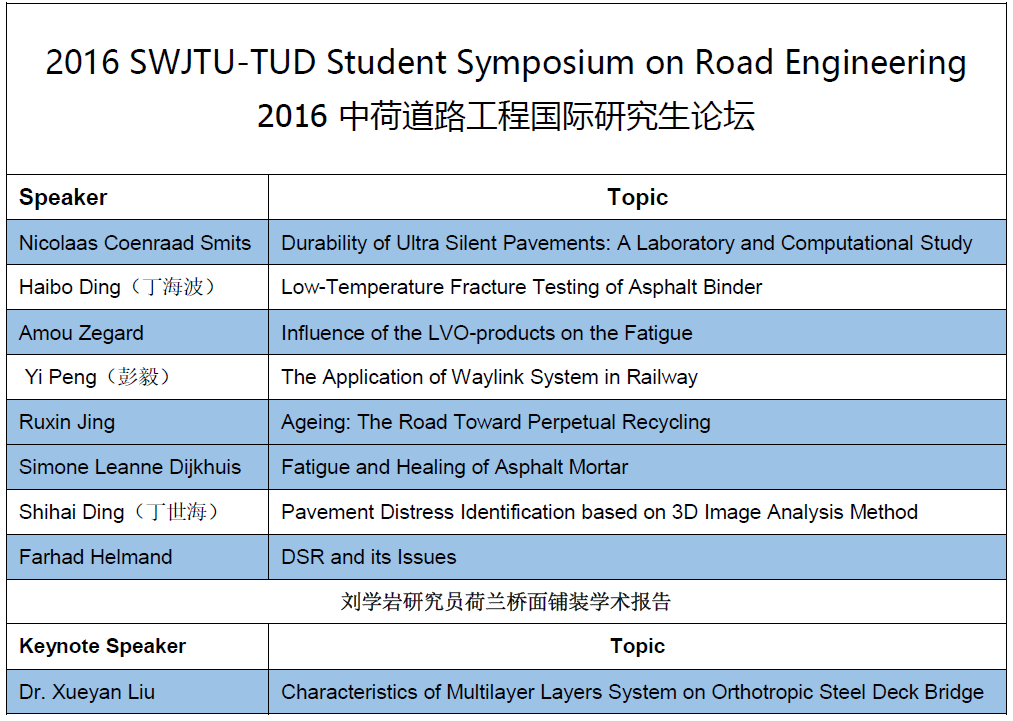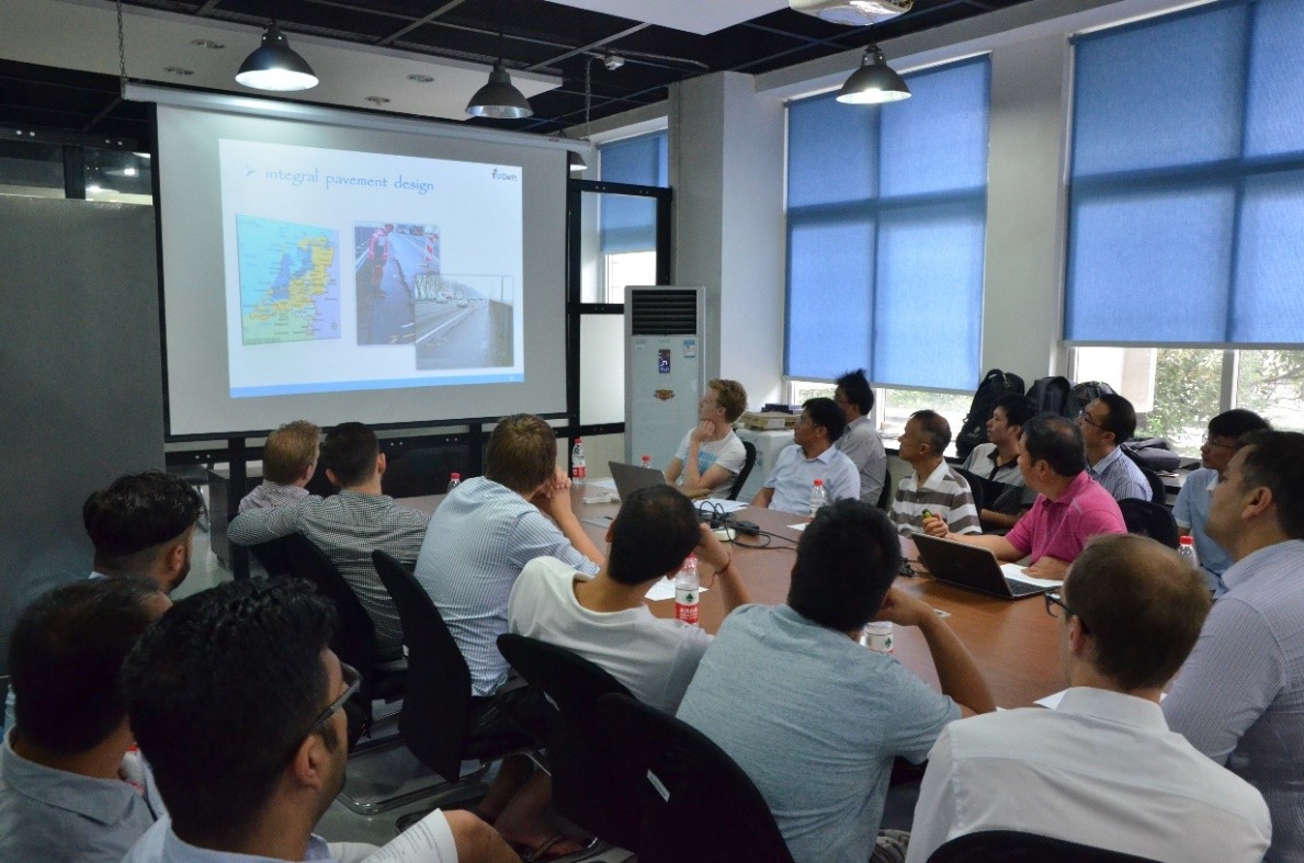 4日上午,中荷道路工程研究生国际学术研讨会在土木学院1400会议室举办。TU Delft师生代表团,公司道路与铁道工程系陆阳教授、艾长发副教授、阳恩慧老师、任东亚老师及研究生参加了本次研讨会。受邱延峻教授委托,艾长发副教授首先热烈欢迎TU Delft师生代表团,介绍公司基本情况,并特别介绍了公司道路工程学科团队概况与主要研究方向。随后Xueyan Liu 研究员从国际学术声誉、校园环境、院系组成、师生概况等方面介绍了荷兰代尔夫特理工大学,并概要地介绍TU Delft路面工程系在沥青混合料微观到宏观力学建模的最新研究成果。随后任东亚老师主持了中荷道路工程研究生国际学术研讨会,来自TU Delft路面工程系的5位博士研究生,与公司的3名博士研究生分别用英语汇报了其课题研究思路与现阶段所取得的学习成果,并同在场师生进行热烈的学术讨论。最后,Xueyan Liu 研究员作了题为“Characteristics of Multilayer Layers System on Orthotropic Steel Deck Bridges”的学术报告,系统的介绍了TU Delft在沥青混凝土桥面铺装先进测试与表征方法的研究成果。精彩纷呈的学术报告和热烈的讨论互动为公司广大师生开拓了研究视野,提高了新的研究思路,促进了学术成果的交流。