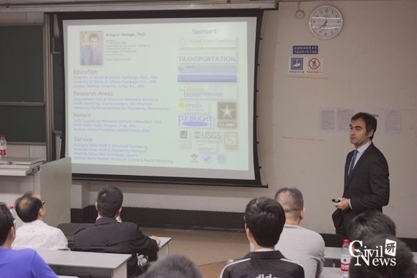 本次Ertugrul Taciroglu教授讲座的题目是《加州桥梁基于性能抗震工程的试验和理论研究》。在讲座中,Ertugrul Taciroglu教授为我们讲述了在加州大学洛杉矶分校进行的基于性能抗震的试验和分析工作,内容包括针对加州已有桥梁和实测地震动的桩土相互作用、桥台-桥梁相互作用、非线性分析方法进展、系统识别方法。