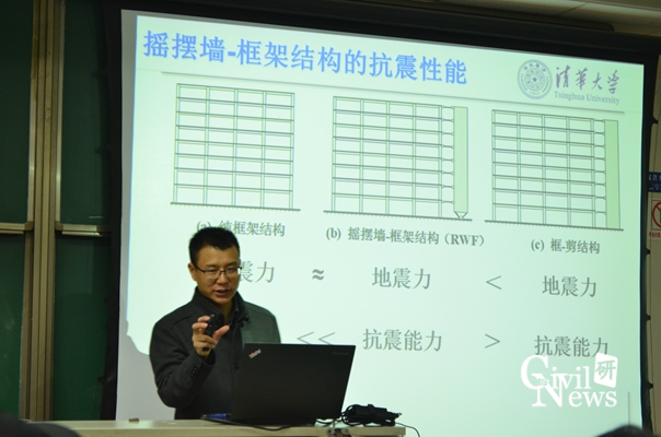 讲座内容分为两个部分:1、拟动力试验技术开发及其在工程实践中应用,2、框架-摇摆墙结构体系开发和工应用。潘鹏教授讲起抗震设计来滔滔不绝,有条有理。由于是应陆地交通地质灾害防治技术国家工程实验室、抗震工程技术四川省重点实验室的邀请,潘鹏教授将重点放在了拟动力试验部分,他讲到拟动力试验的加载就是静态的“拟”,拟动力通过求解动力方程获得“动力”,可以模拟结构地震反应,并具体讲了拟动力试验中的子结构技术。