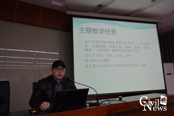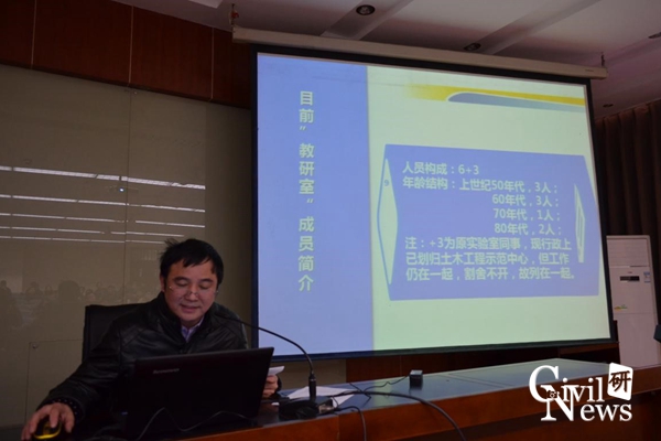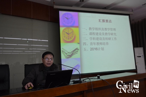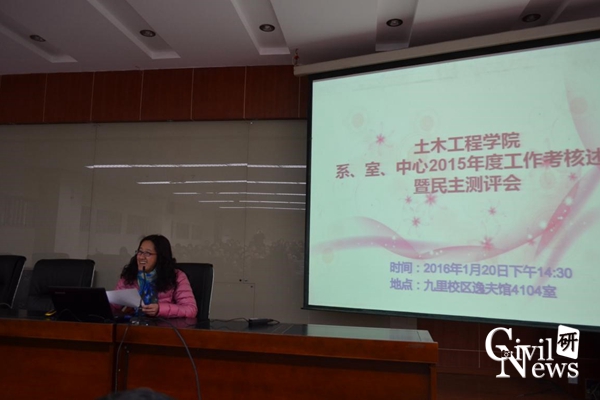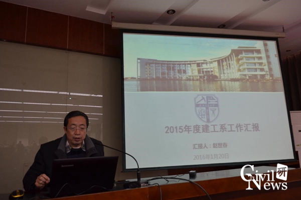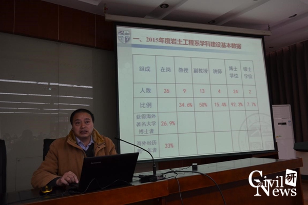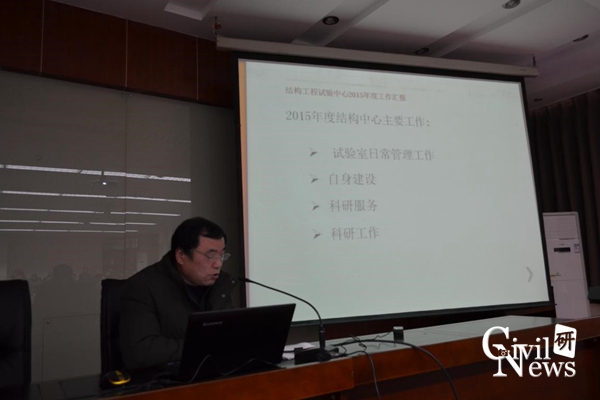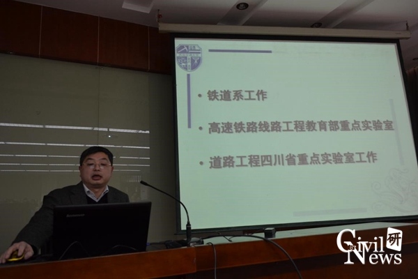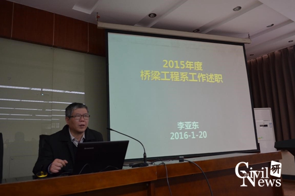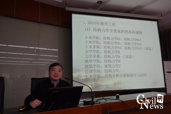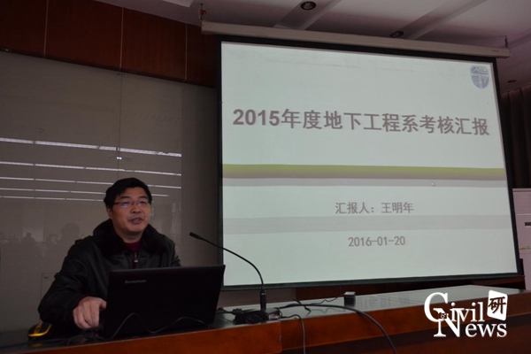 随后是jn江南各系、室、中心的代表对2015年工作述职的PPT展示,其中包括道铁系(含高速铁路线路工程教育部重点实验室、道路工程四川省重点实验室)、桥梁系、地下系(含交通隧道工程教育部重点实验室)、岩土系、建工系、建材教研室、水力教研室、结构力学教研室、制图教研室、结构中心、岩土中心、风工程中心、土木实验教学示范中心、防灾减灾、国家工程实验室(含抗震工程技术四川省重点实验室)。