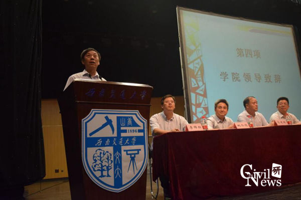 随后,研究生新生代表李孝攀同学发言,他在演讲中提议在座的2015级新生:作为一名交大土木人应该勇于挑战困难,不断进取,不断提高自己,成为一名合格的“五有交大人”。