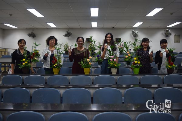 老师们与插花作品合影留念