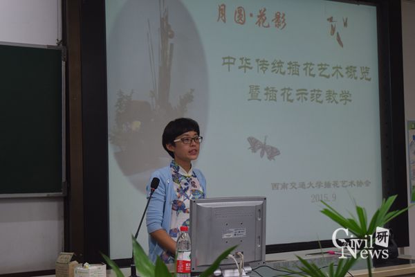 2015年9月23日晚上七点在网络学院5202教室,以“月圆-花影”为主题的中华传统插花艺术概览暨插花示范教学活动准时开展。本次活动由jn江南工会举办,江南体育官方网站插花艺术协会协办,由插花艺术专家杨江丽老师主讲。旨在丰富教师业余文化生活,增进彼此了解,在繁忙的工作之余得到放松,同时了解插花艺术和学习插花技巧。到会嘉宾有江南体育官方网站工会郑江副主席、土木工程公司党委副书记李彤梅、插花艺术协会会长罗中琼老师等协会老师及jn江南的女教师们。