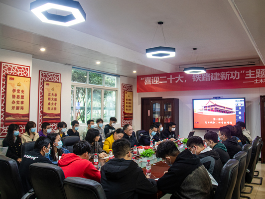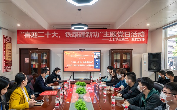 为深入学习贯彻习近平新时代中国特色社会主义思想,推进学校第十五次党代会精神落实落地,引导激励广老员工党员坚定理想信念,奋进新征程,建功新时代,以实际行动迎接党的二十大胜利召开,10月14日下午16:00,土木员工第二、三党支部于犀浦校区天佑斋3栋红色驿站组织开展“喜迎二十大,铁路建新功”主题党日活动,此活动属于江南体育官方网站员工党支部主题党日展示活动第二期。受邀参与此次活动的主讲嘉宾有:jn江南退休老师邓午天、中铁一局高原铁路指挥部总工程师孟维孝、高原铁路建设工作者刘军。公司党委员工工作部副部长李国芳、公司党委组织部王文菊、公司党委员工工作部宿舍园区员工管理科孙亚男、土木工程公司党委副书记周曦莅临现场参与本次党日活动。
