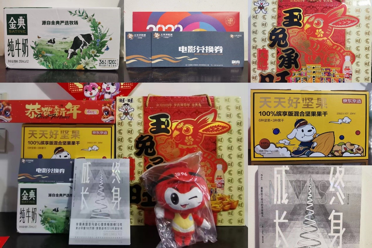 今年,学院为每一位留校员工精心准备了“红小土陪你过大年”新春慰问大礼包:一盒坚果礼盒,一箱金典有机牛奶,一袋兔年限定旺旺大礼包,一本书《终身学习》,两张春节档电影票。此外,还准备了营造节日氛围的“福”字、春联、红小土玩偶等小礼品。