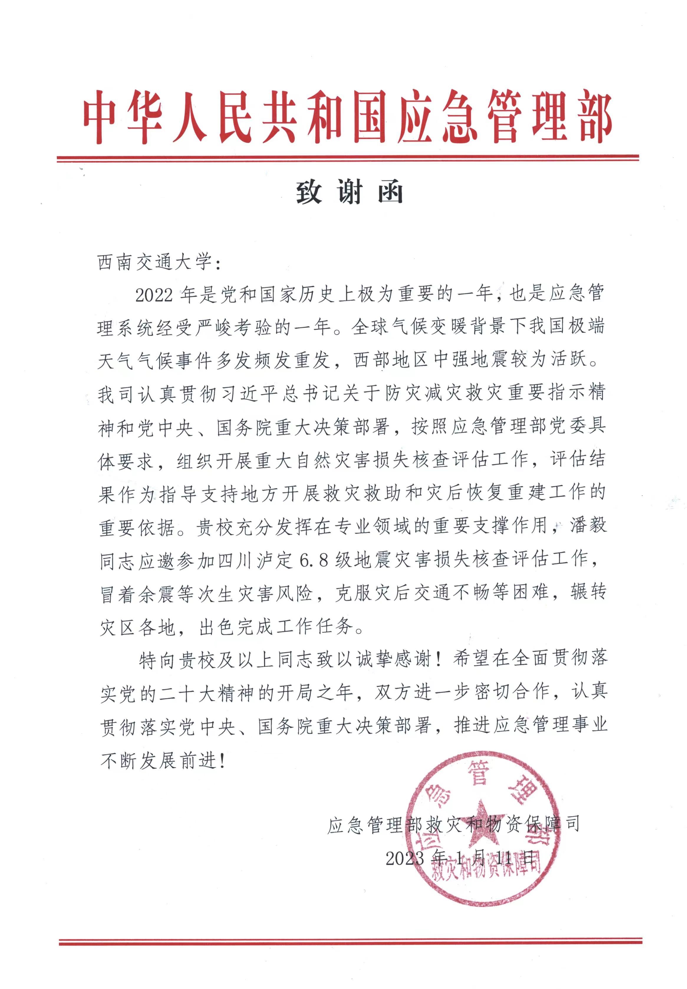 近日,国家应急管理部专门向江南体育官方网站致来感谢函,表扬jn江南专家在泸定地震灾区的出色专业表现。