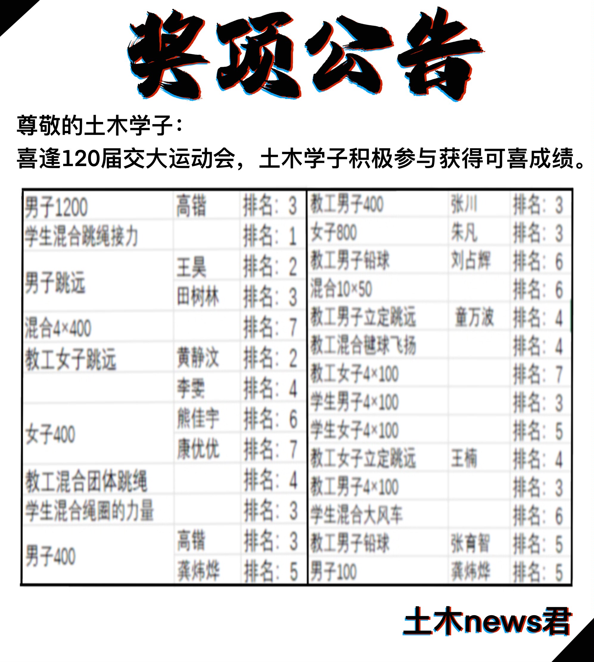 祝贺本次活动中为jn江南争得荣誉的运动员们,也感谢为本次活动做出贡献的工作人员和志愿者们。希望同学们在此之后都能以顽强拼搏、自强不息的土木精神迎接生活中的各项挑战。期待下一次运动会公司能再铸辉煌!