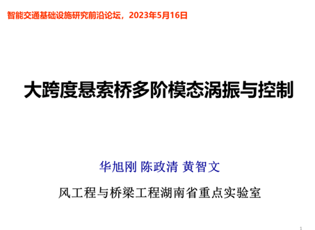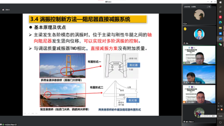 随后,由本次论坛的报告人,湖南大学华旭刚教授向大家分享了湖南大学风工程研究团队自2011年以来在悬索桥多阶涡振方面的研究成果。他详细介绍了悬索桥发生涡激共振原理及相应研究背景、悬索桥的多阶涡振预测理论及试验技术、涡振振幅限值研究成果、涡振控制基本策略与多种控制方法等重要内容。华旭刚教授的报告系统梳理了该领域的最新研究进展,结合工程实例讲解了悬索桥涡振治理思路及减振效果验证方法,为与会者提供了宝贵的学术借鉴,使大家对悬索桥多阶涡振问题有了更深入的理解。