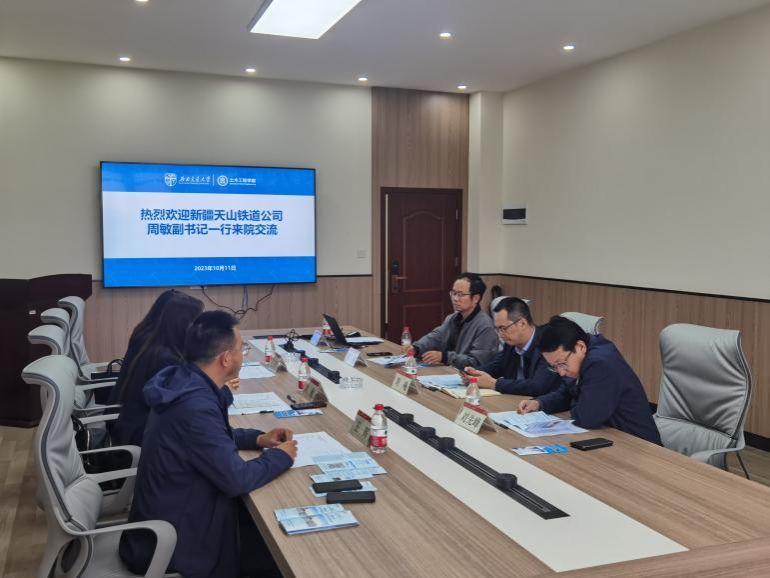 2023年10月11日上午10:00,新疆天山铁道公司党委副书记周敏、总会计师宁卫琴、党政办公室主任王辉一行走访JN体育,并于犀浦校区X4417B会议室开展校企合作座谈交流,土木工程公司党委副书记周曦、道路与铁道工程系副主任刘先峰、培训中心副主任朱明与本科生就业专项负责人李裕参与此次座谈。