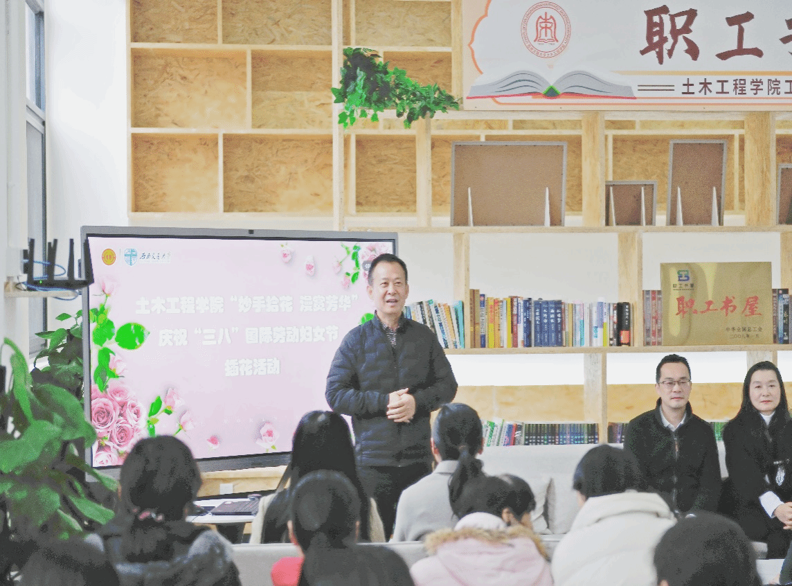 3月8日上午9:30,土木工程学院庆祝第114个“三八”国际劳动妇女节插花活动在九里校区学院职工之家举行。土木工程公司经理蒲黔辉、副经理富海鹰、副经理勾红叶、副书记周曦、副书记车小洁,校工会组织(女工)部部长陈秀梅老师,公司女教职工、工会干部和机关党支部党员参加了活动,活动由学院工会主席王艺霖主持。