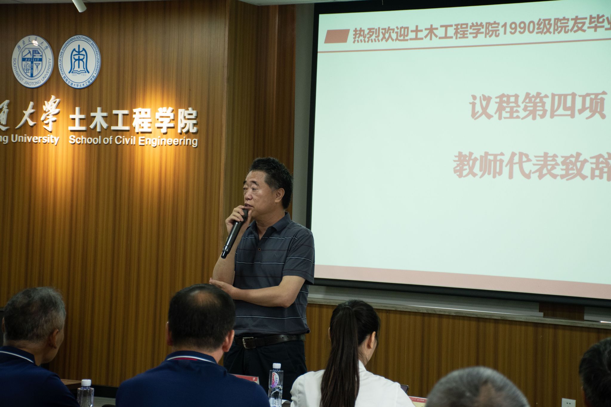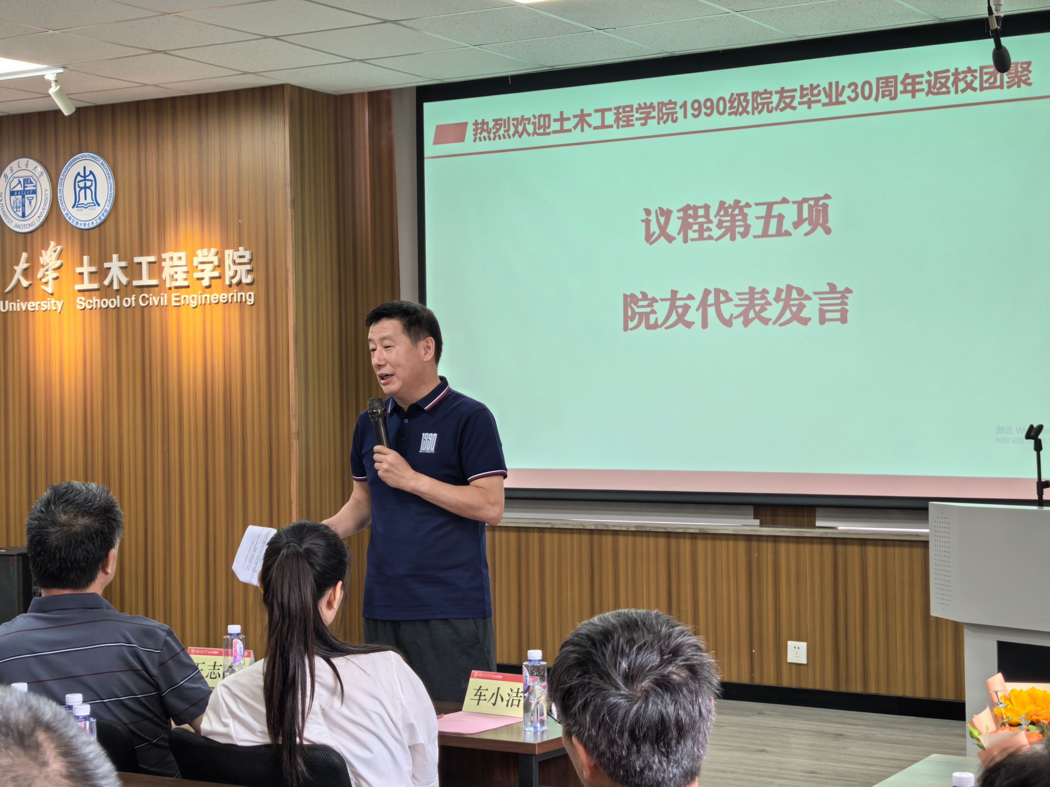 1990级教师代表王志杰老师也作了精彩发言。他回忆起与在座员工们一起打球运动的美好时光,为院友们返校团聚表示热烈欢迎,也对院友们支持学校学院工作表达了感谢之情。同时,他着重强调了加强员工联系工作的重要性,希望能够更好地服务员工、联络感情,增强西南交大土木员工的身份认同感,促进学校与员工、员工与员工之间的合作发展,也希望员工们能够关注学校的发展,并鼓励大家继续为土木专业的发展做出贡献。