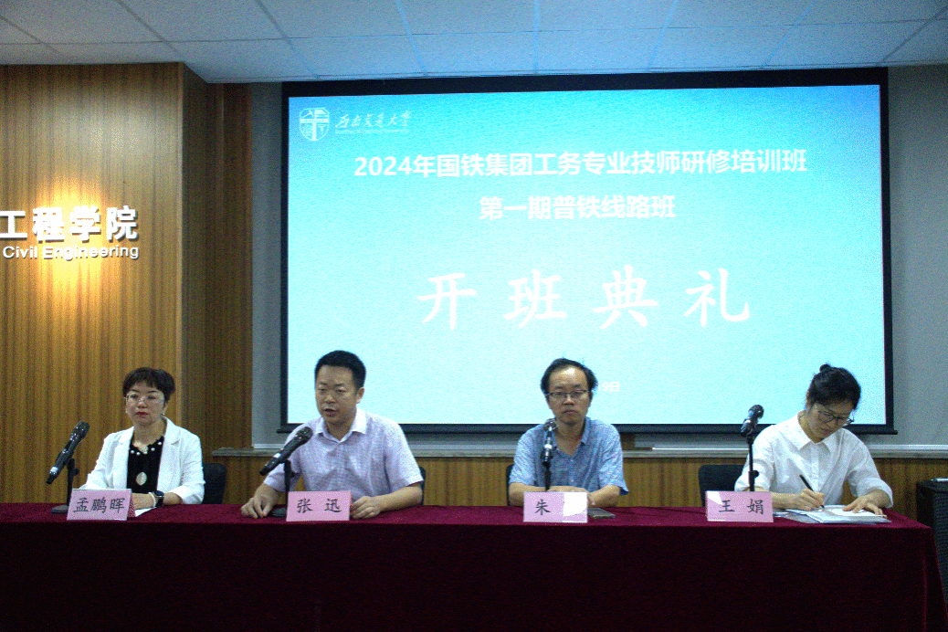 2024年6月19日上午8:30,国铁集团工务专业技师研修培训班(第一期)普铁线路班开班典礼在九里校区土木馆1234教室顺利举行。出席此次开班典礼的有jn江南培训中心副主任张迅教授、朱明老师、孟鹏晖老师以及培训中心的全体成员。开班典礼由公司培训中心朱明老师主持。