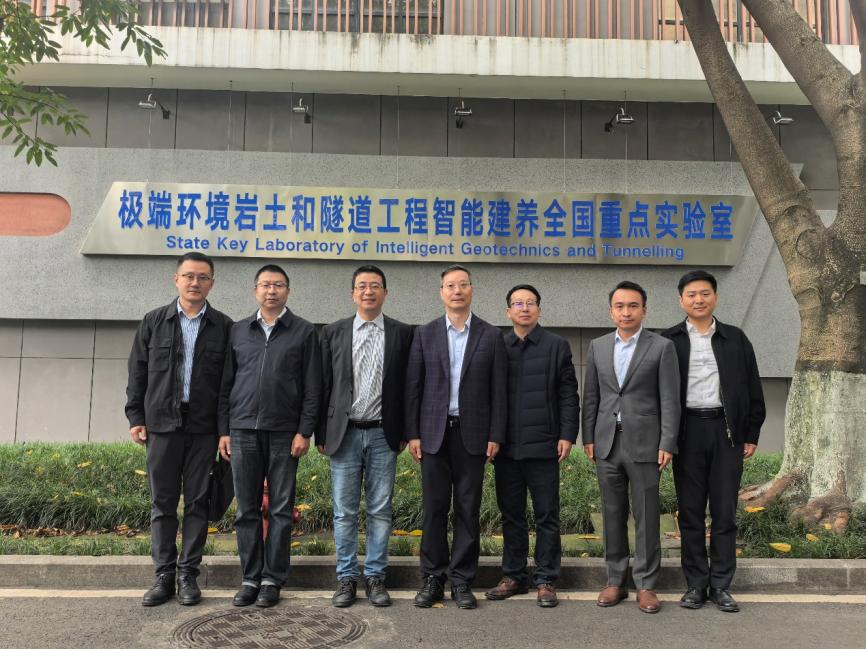 首先,调研团队到极端环境岩土和隧道工程智能建养全国重点实验室进行参观。张志强教授详细介绍了实验室的发展历程、团队结构、科研成果、运行与管理机制等情况,并带领调研团队参观了实验室相关实验仪器,介绍了有关仪器的实验原理,并就相关问题进行交流和探讨。