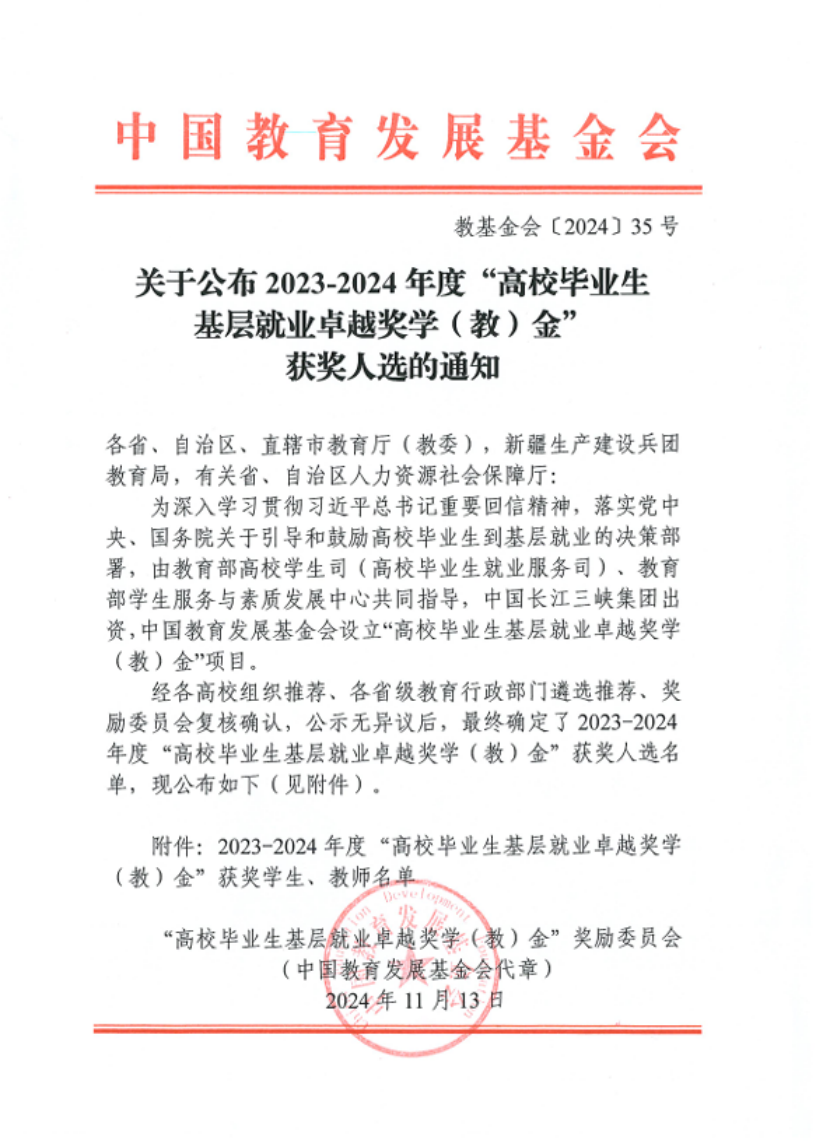 “高校毕业生基层就业卓越奖学金”由教育部高校员工司(高校毕业生就业服务司)、教育部员工服务与素质发展中心共同指导,中国长江三峡集团有限公司出资,中国教育发展基金会特设,旨在深入学习习近平总书记重要回信精神,贯彻落实党中央、国务院关于引导和鼓励高校毕业生到基层就业的决策部署,奖励赴基层就业创业并做出突出业绩的普通高校毕业生。2024年,全国共有398名优秀高校毕业生获得奖励。此次公司毕业生荣获“高校毕业生基层就业卓越奖学金”是对公司就业工作的充分肯定,公司将继续鼓励更多毕业生扎根基层、服务基层,努力为国家重大战略、重大工程贡献交大土木力量。