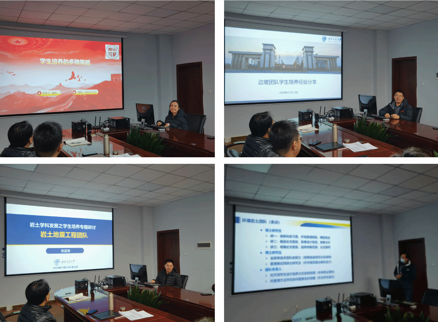 紧接着,活动围绕岩土学科发展之公司产品开展了专题研讨,首先由杨兵介绍了岩土系研究生的培养情况,然后,各团队负责人袁冉老师、杨涛老师、张迎宾老师和余炎老师交流了各自在科学研究、日常管理等方面的经验,此后,大家在导师联培、学术不端、成果署名以及团队氛围等方面积极开展了热烈的交流。