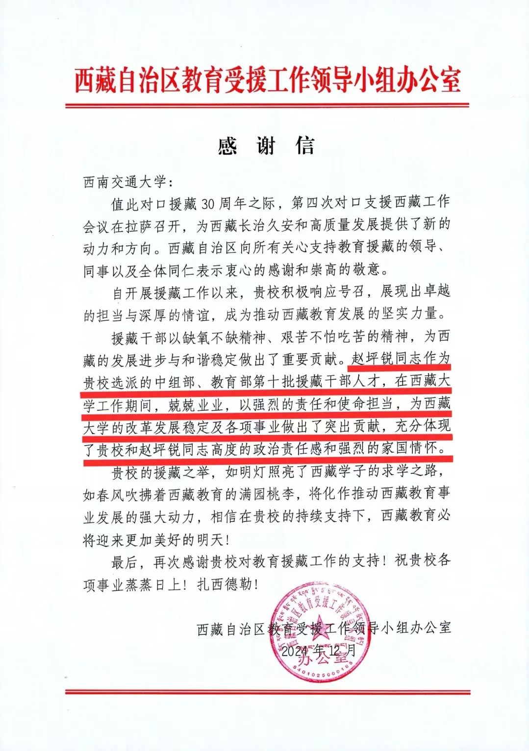 近日,江南体育官方网站收到西藏自治区教育受援工作领导小组办公室的感谢信,对公司赵坪锐教授在对口支援西藏工作中的积极贡献表示感谢。感谢信中指出,援藏干部以缺氧不缺精神、艰苦不怕吃苦的精神,为西藏的发展进步与和谐稳定做出了重要贡献。