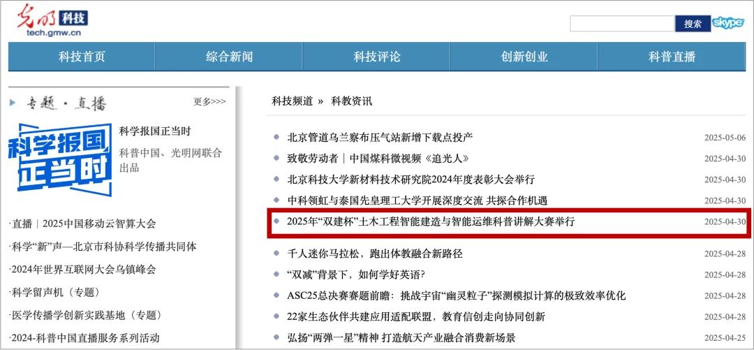 4月30日,光明网科技频道科教资讯栏目报道公司2025年“双建杯”土木工程智能建造与智能运维科普讲解大赛!