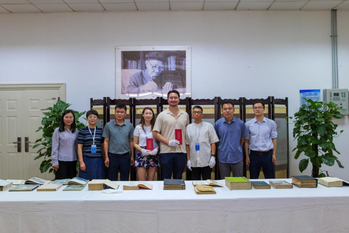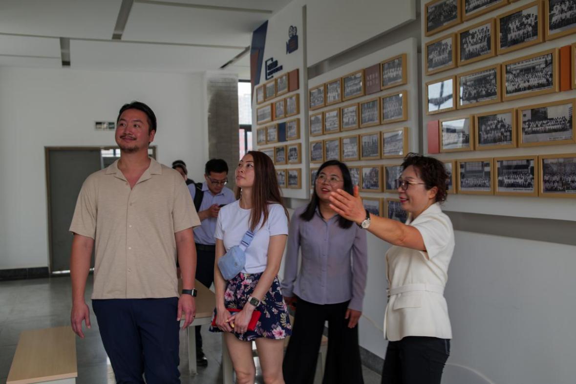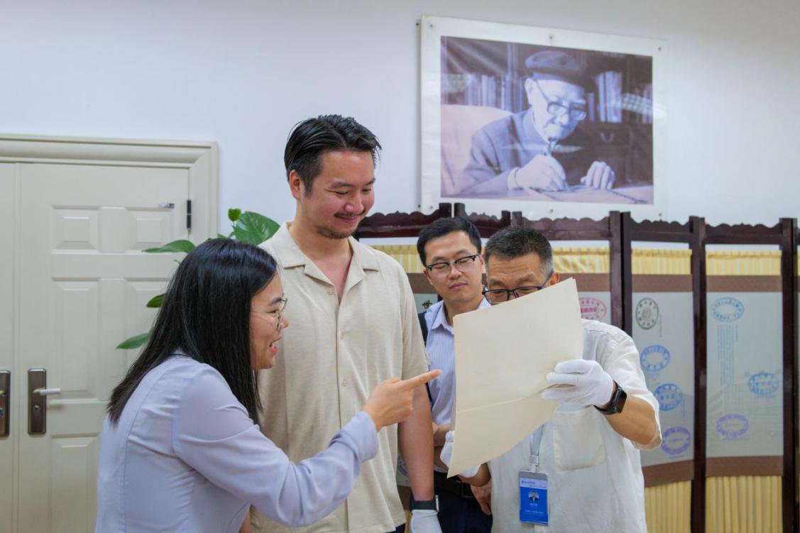 在图书馆,夫妇受到热情接待。在图书馆馆长和大使的引导下,他们重点参观了馆内珍藏的林同炎先生求学时期的宝贵史料。在古籍特藏区,他们见到了林同炎先生当年在唐山交大求学时的毕业设计手稿原件,泛黄的纸张、工整的字迹,无声诉说着青年林同炎严谨治学的态度和在工程领域展现的非凡天赋。这些珍贵档案是公司“严谨治学、严格要求”双严传统的生动写照,也让夫妇二人得以近距离触摸祖父的青春岁月与学术起点。