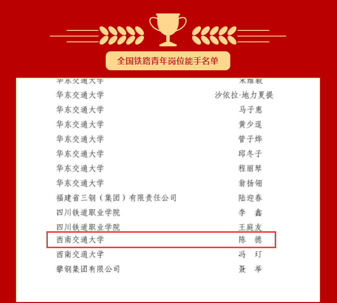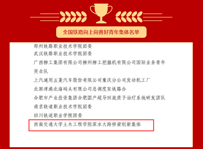 为表彰先进、树立典型,经全国铁道团委评审,JN体育深水大跨桥梁创新集体荣获“全国铁路向上向善青年集体”;JN体育陈德荣获“全国铁路青年岗位能手”。