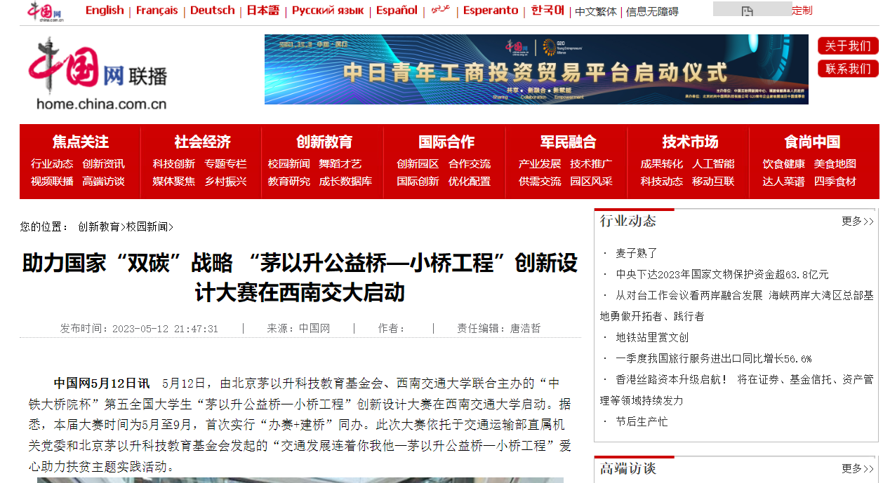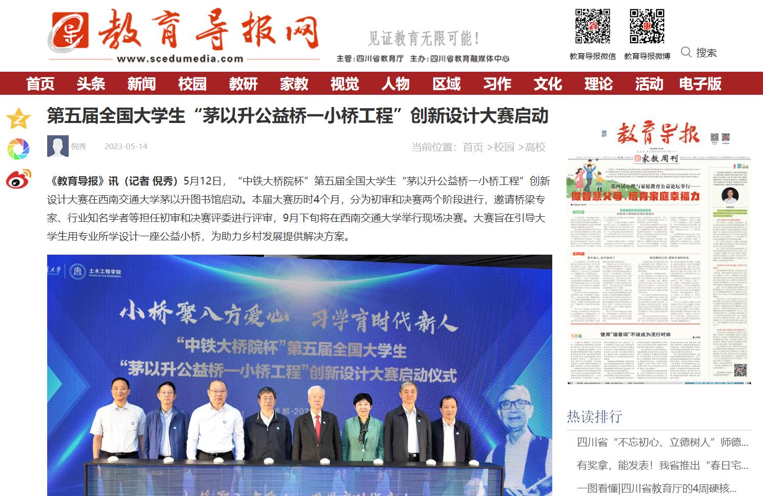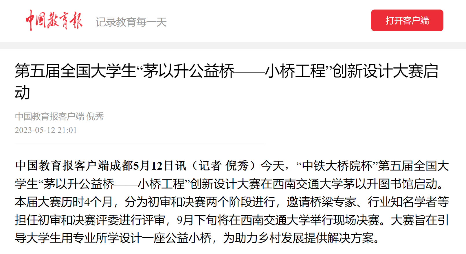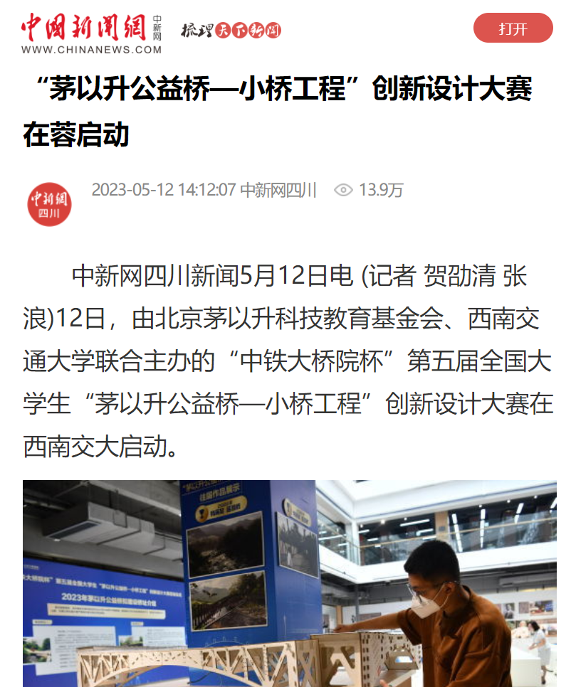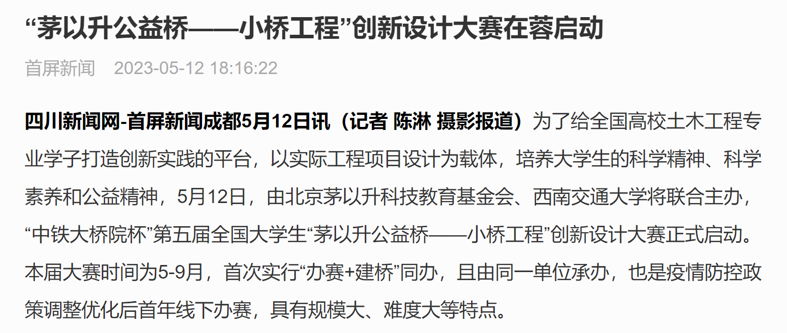 一、【中国网】助力国家“双碳”战略 “茅以升公益桥—小桥工程”创新设计大赛在西南交大启动