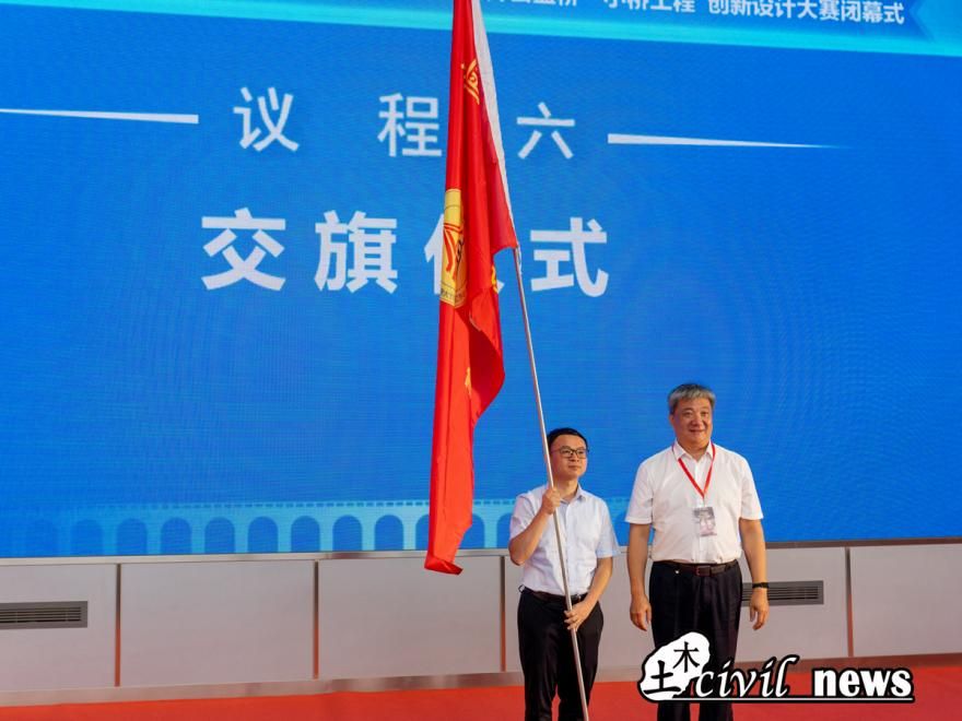 闭幕式最后,进行第五项议程——交旗仪式,并由下届承办单位福州大学发言。首先,福州大学jn江南常务副经理赖志超教授对“茅以升公益桥—小桥工程”设计大赛为青年员工搭建绽放平台,也为各高校搭建学术交流、理念交互的平台表示高度认同。同时,赖教授衷心祝贺本次设计大赛取得圆满成功,彰显了青年学子善于创新创造的无限潜能。最后,赖教授向大家发出邀请,欢迎大家积极参与由福州大学承办的下届大赛,期待明年再度相聚。