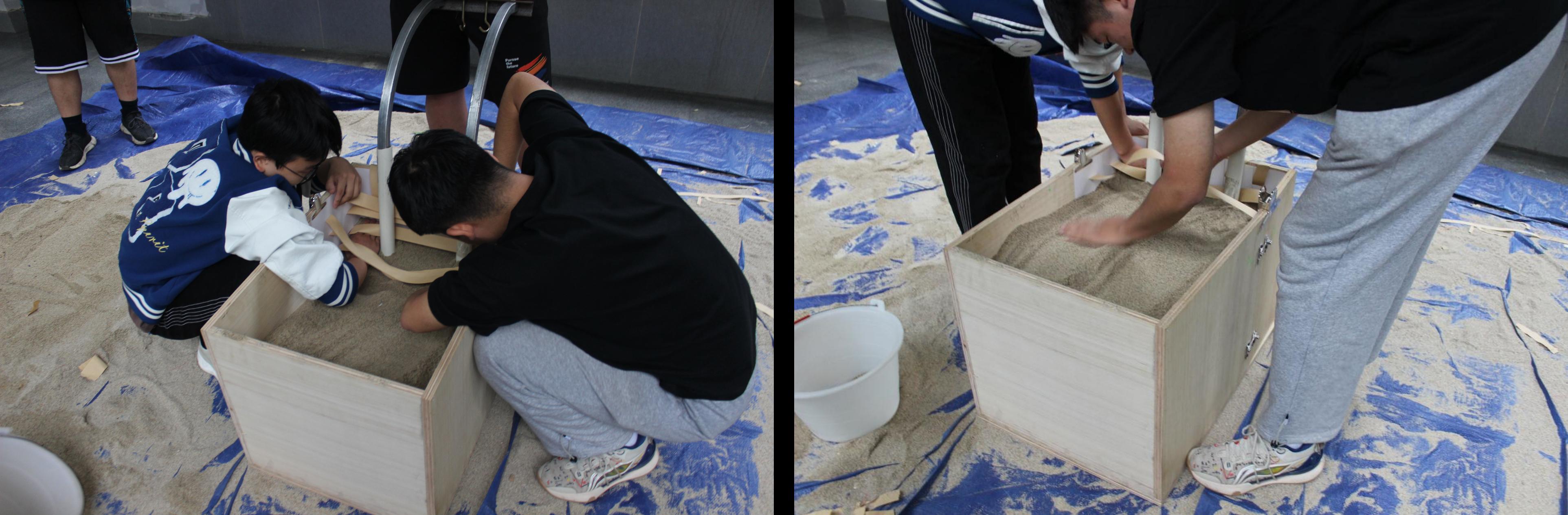 答辩结束后,比赛进入最后的实际加载环节,各小组带上自己的模型来到四教中庭,按照比赛流程将支护板两侧填满沙土,安装好测量装置,挖去一侧沙土的同时撑入支护锚杆。支护安装完毕后,于另一侧沙土之上堆加荷载,并由科创中心相关的负责人员对荷载的大小进行记录,以此对支护的强度做出判断。